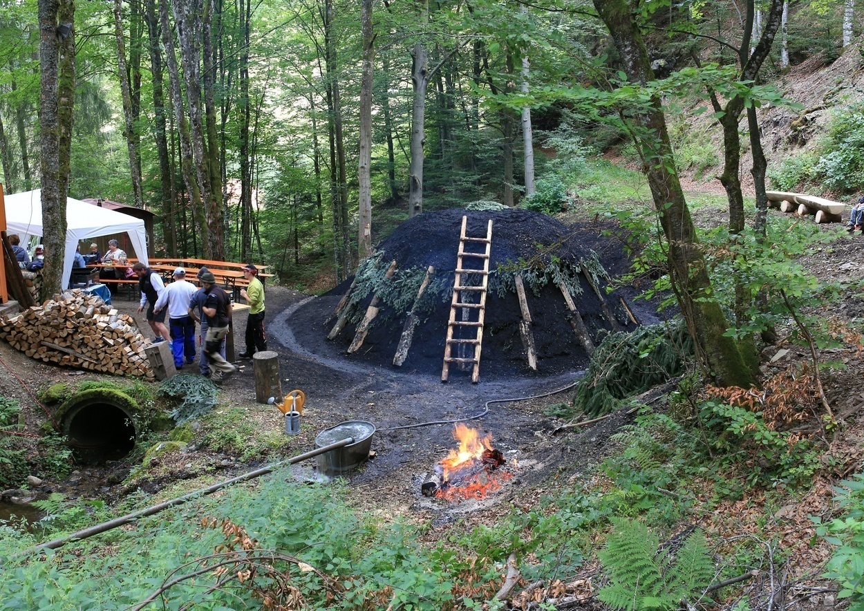 Bereits zum 11. Mal wird in dem kleinen Bergdorf Wieden wieder ein mächtiger, rabenschwarzer Kohlenmeiler in Glut gesetzt. Mittlerweile gibt es nur noch wenige Leute, die das alte Handwerk Köhlerei von Grund auf kennen. Lukas Sprich und sein Team, darunter Franz und Christof Wunderle, aus einer alten Köhlerfamilie stammend, setzen diese alte Tradition fort. Der Meiler brennt bis etwa zum 19.06.2026 und muss ständig bewacht werden. Gewonnen wird hochwertige Holzkohle, die sich hervorragend zum Grillen eignet. Während der rund zwei Wochen ist für Verpflegung bestens gesorgt. Größeren Gruppen wird das traditionelle Handwerk auf Voranmeldung gerne gezeigt. Anmeldung unter Telefon +49 (0) 172 749 2882.